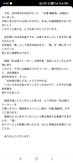 铃木卓尔拍摄的另一个起因,是被原著里的关于跟踪猫咪的观念所打动。 猫だけではありません、人にもまた空白の時間があります。 不仅仅是猫咪,人也有自己的“时间段”,有哭有笑有不想被其他人所看见的时间段。 わたしたちは、愛する人を絶えず見張っているわけにはいきませんし(そうすると本当のストーカーですが 我们不可能时刻关注着我们所爱的人(那样我们就变成跟踪狂了) 例えばその人の“過去”を見張るわけにはいきません。 我们也不可能,比如,窥探他们的“过去”,或是控制他们的未来。 原著作者浅生ハルミン写到,无论你多么爱猫,都会消失的。于是我想到,东京的变化,其实就如猫的消失一样,结尾铃木卓尔让猫不经意咬掉项圈走失,在内心已经明白结果了吧。而结尾最后一幕动画,是猫咪用屁眼对着镜头走了一段路后回头,一开始还觉得是制作动画的大山慶恶趣味,后来才想起有一种说法是猫咪只有对完全信任的人才会露出屁股,算是另类解读下埋藏着的一种无可奈何消逝却又温柔的回答。 影中「古書 猫額洞」现实于2014年5月10闭店。