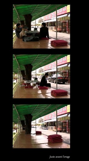 部分观众定也曾对2003年卢梭造访韩国,出席全州国际电影节期间拍摄的《暴雨前》(Juste avant l’orage)产生过相同的疑问:为何一个拍摄街头货摊的低角度固定镜头能如此令人着迷?画面中,坐着歇息的男子刚刚离开,一名女子在店内清洁,家庭出现在远处,摩托车、轿车接连呼啸而过,如同雅克·塔蒂(Jacques Tati)编排的群舞,但这并非喜剧。是否刻意为之?