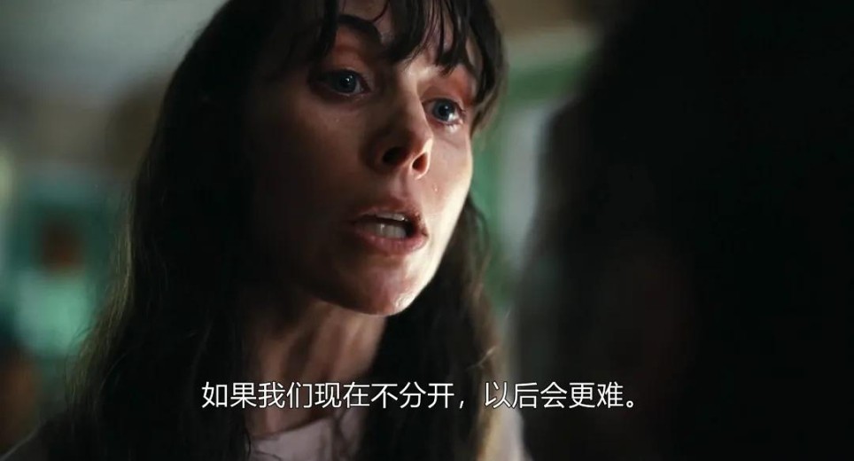 不论蒂姆和米莉起初黏连的双腿、粘在一起的双唇,后来因“磁力相吸”逐渐融合的手臂,《同甘共苦》对身体的展示似乎只满足于点到即止、见好就收的程度,就拿米莉一咬牙用锯子将两人手臂锯开一幕为例:镜头聚焦于二人痛苦狰狞的面部特写,至于切割过程,只拍了短短几秒且以前景虚焦呈现,之后便迅速切到事毕场景,影片的克制由此可见一斑。