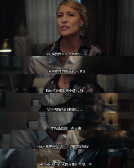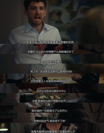 看点2:本剧有心理学的深刻含义。看似讨论了很多人的关系,母子关系,母女关系,夫妻关系,恋爱关系,其实说到底,讨论的都是爱的边界。 劳拉爱丹尼尔,但儿子27岁了,仍然对他的生活了如指掌,照顾的无微不至,这太让人窒息了,这不是爱,是控制。 切蕊像个美丽的小野兽,你对她爱,她就可爱无比,她对劳拉最初并没有任何恶意。但劳拉的看不起,劳拉的挑衅激发了切蕊心中的野性,一旦发作,如洪水猛兽。 切蕊想给丹尼尔一家留下时髦漂亮有礼貌的印象,奈何阶层的鸿沟让她骄傲内心受的伤太多了,她的贫穷维持不住她的野心。她不由自主的撒谎,为了圆谎继续撒谎,一步步滑下深渊,自己酿的苦酒终将自己喝下。